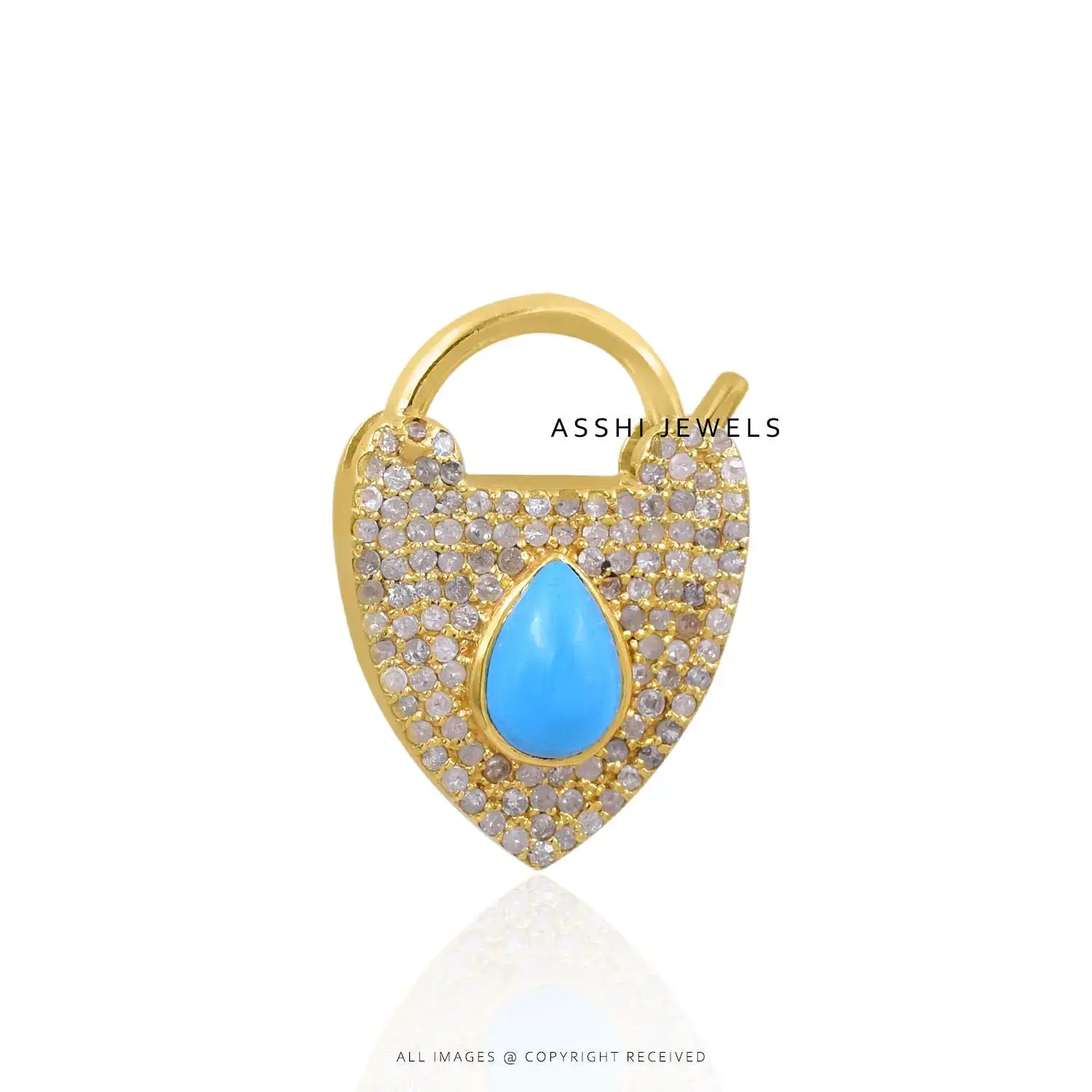 Fall in love with this stunning heart-shaped padlock, beautifully crafted in 14K yellow gold plating. Featuring a vibrant turquoise inlay and delicate diamond accents, this piece blends bold color with timeless sparkle. The one-side openable design adds both charm and functionality, making it easy to wear as a pendant, bracelet charm, or statement accessory. Symbolizing love and protection, this padlock is a perfect gift or keepsake for someone special—or a meaningful addition to your own collection.