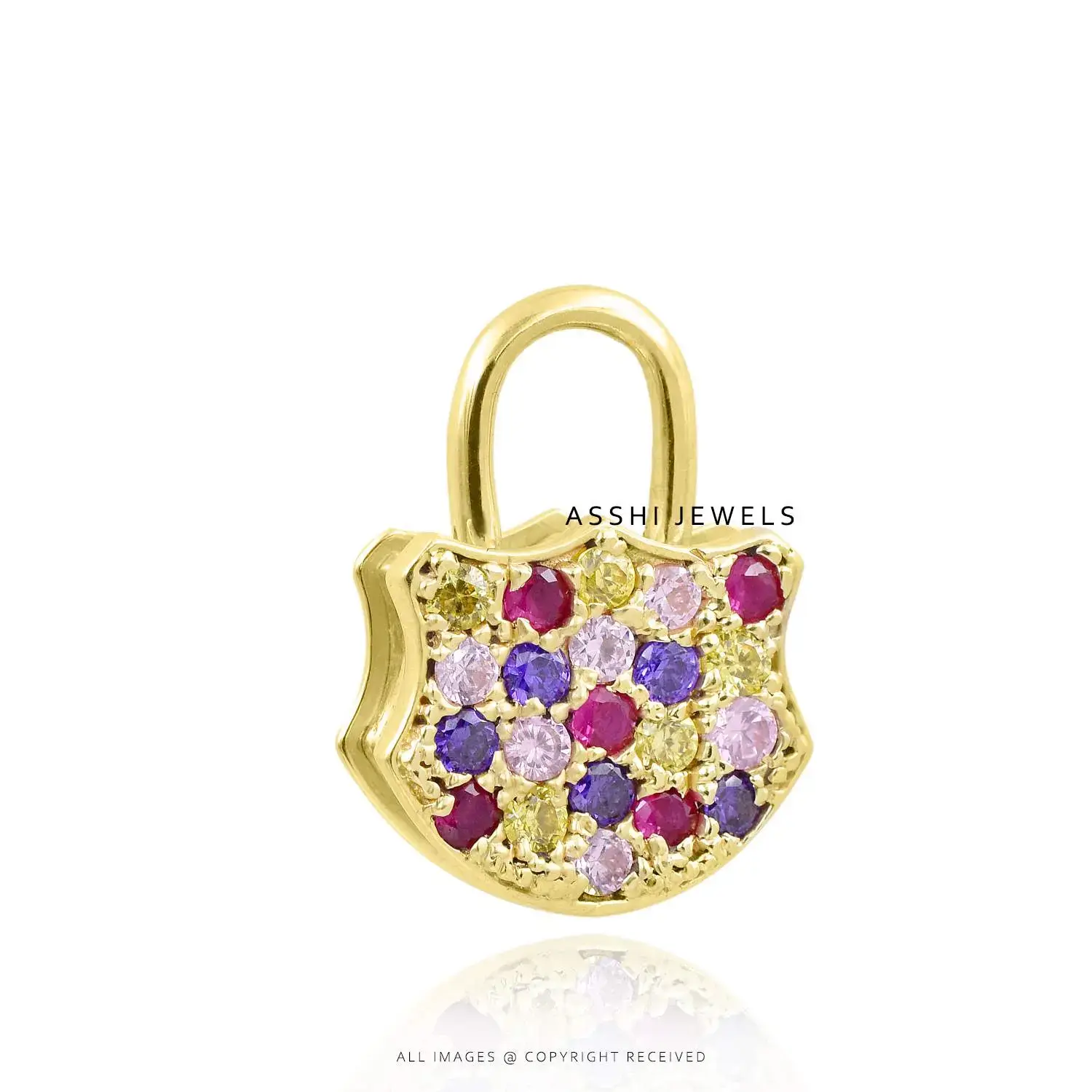 Add a touch of sparkle and sophistication with this 14K yellow gold plated padlock pendant, adorned with multiple dazzling cubic zirconia stones. Designed with a spring-open mechanism, this unique padlock combines functionality with elegant style. The shimmering CZ stones catch the light beautifully, making it a standout accessory for any outfit. Perfect for layering or wearing solo, this piece embodies modern charm with a hint of playful versatility.