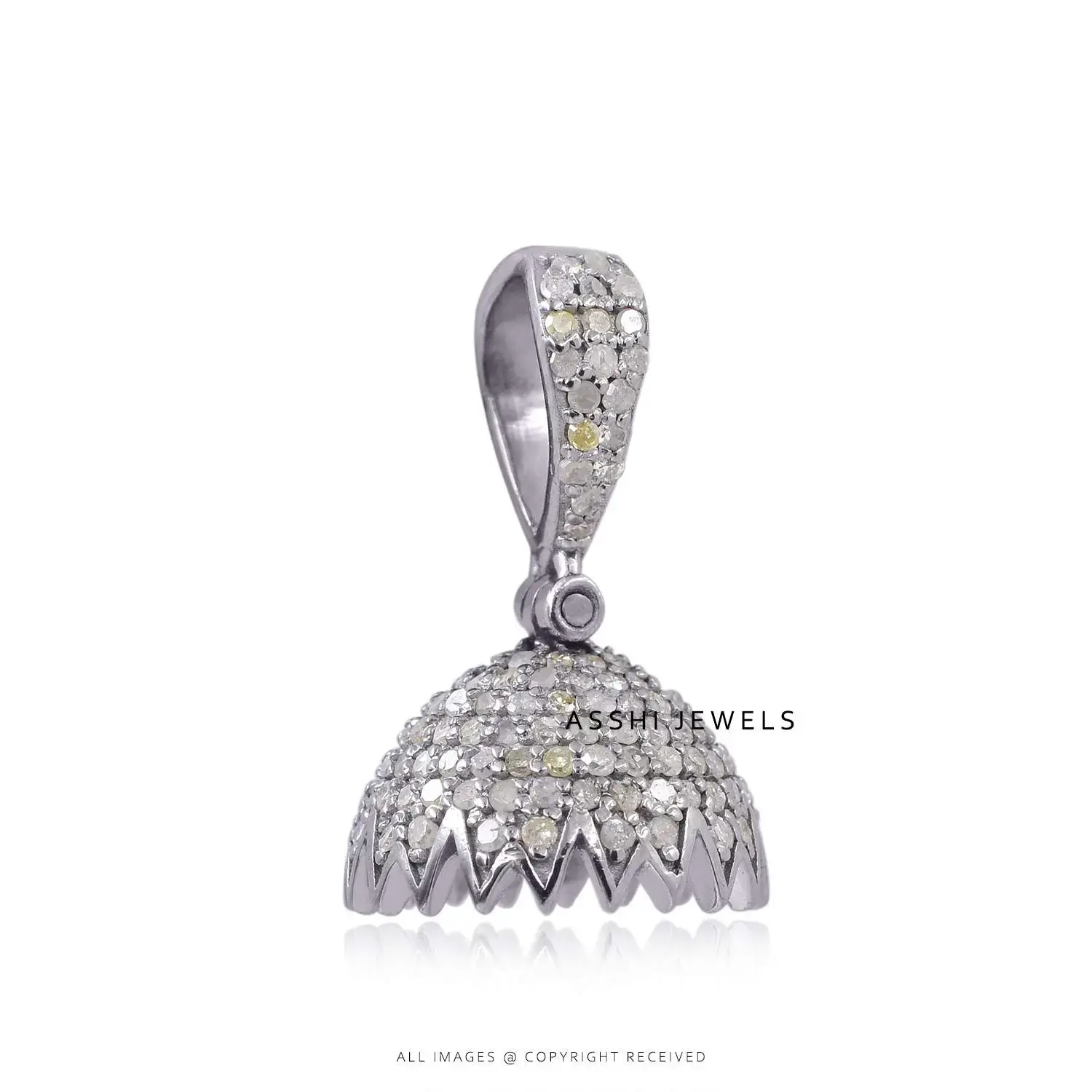 Celebrate timeless tradition with a modern sparkle in this exquisite 925 Silver Diamond Jhumka Pendant. Crafted from high-quality sterling silver, this pendant features the classic jhumka bell shape—an iconic design inspired by traditional Indian jewelry—adorned with dazzling diamond accents that add a brilliant shine and contemporary elegance.