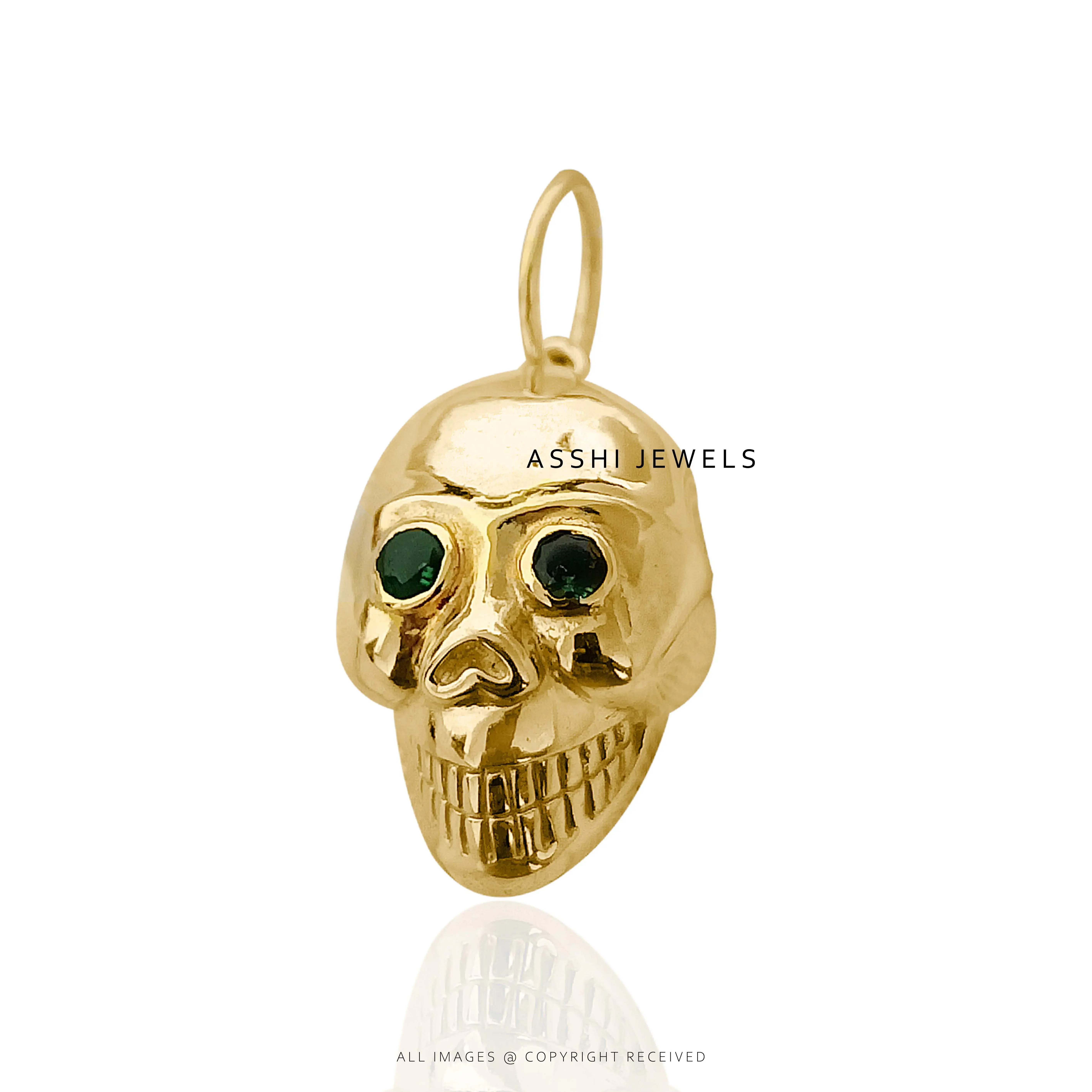 Add an edgy yet elegant statement to your jewelry collection with this stunning 14K yellow gold skull charm. Featuring vibrant green cubic zirconia stones intricately set to create a striking contrast, this charm blends luxury with bold style. Perfect for those who love unique, modern accessories with a touch of rebellious flair.