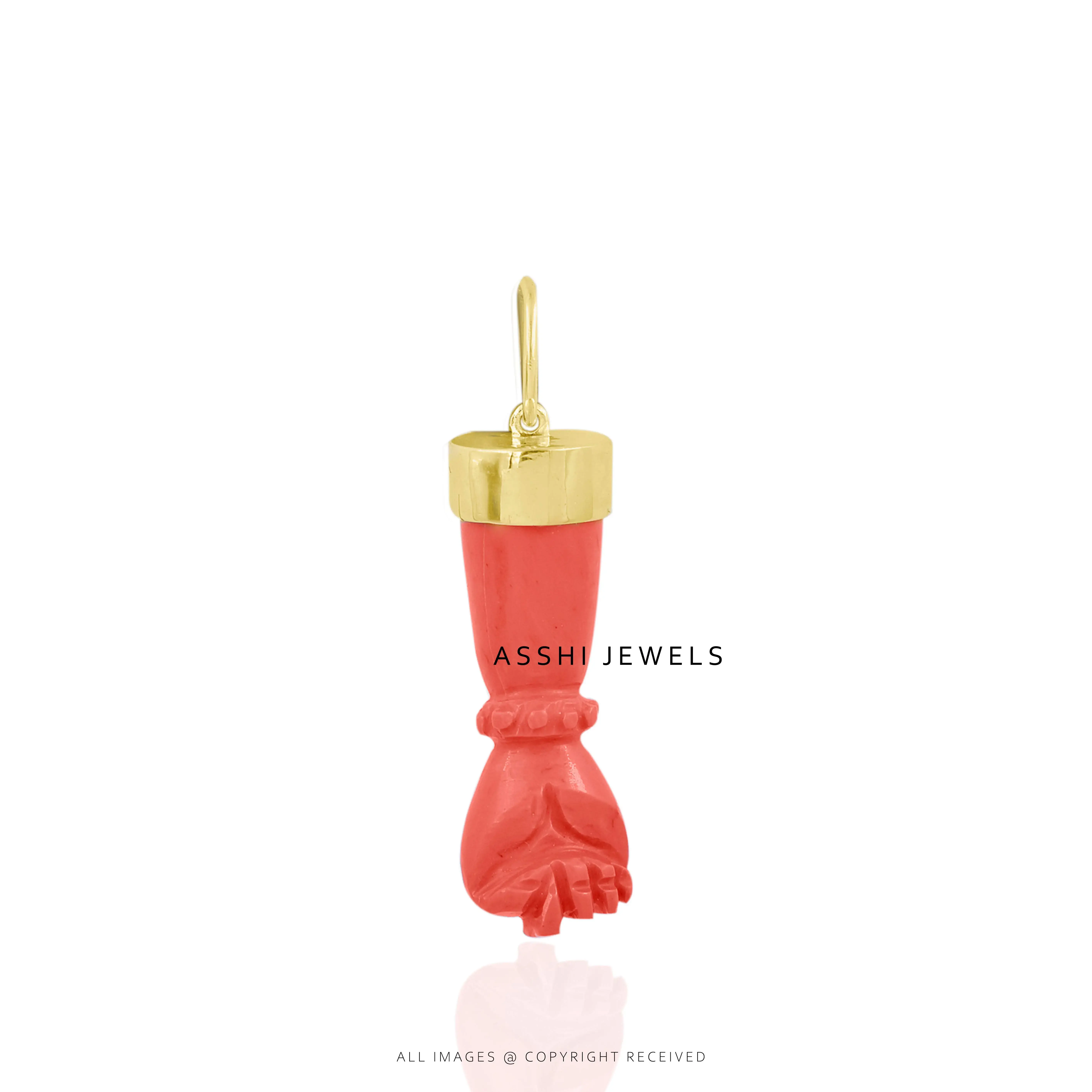 Infuse your jewelry with meaning and charm through this elegant 14K yellow gold plated Figa charm, beautifully detailed with a coral-colored finish. The Figa, a traditional symbol believed to ward off negativity and attract good luck, carries deep cultural significance. Paired with the warmth of gold and the bold hue of coral, this charm offers both protective energy and vibrant style.