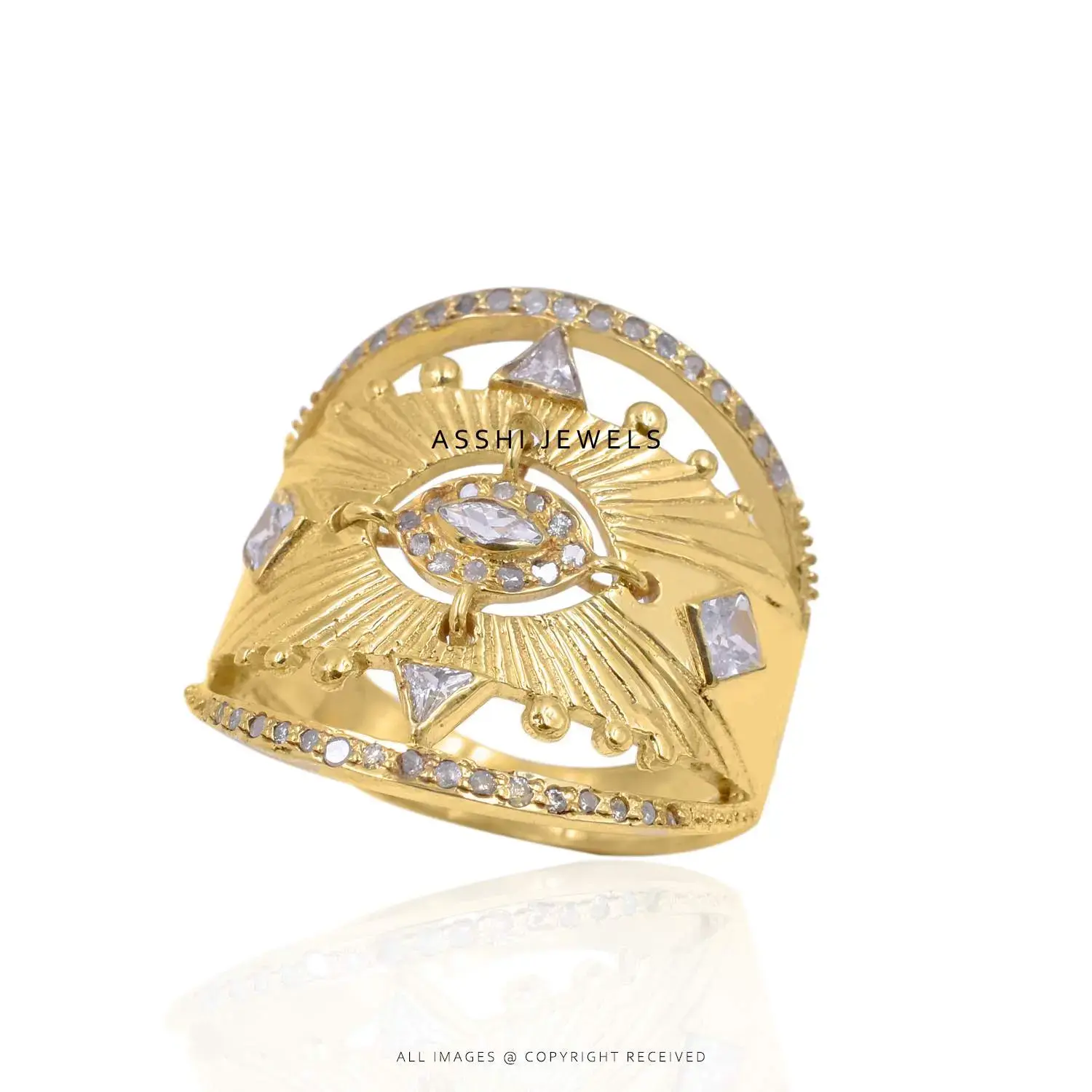 Protect your energy in style with this stunning 14K yellow gold plated Evil Eye ring, adorned with sparkling diamond-like stones. The iconic Evil Eye symbol—believed to ward off negativity—is given a luxe upgrade with brilliant accents and a polished gold finish. Perfect for daily wear or gifting, this ring blends meaningful symbolism with modern elegance, making it a must-have piece for any jewelry collection.