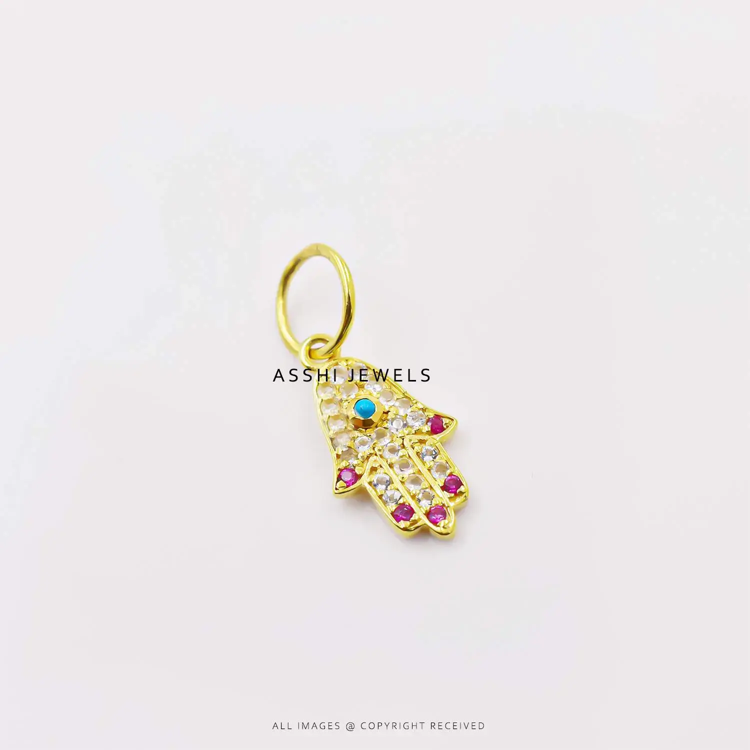 Infuse your jewelry collection with powerful symbolism and luxurious sparkle with this 14K Yellow Gold Plated Figa Hamsa Hand Charm, beautifully adorned with shimmering diamonds and vibrant rubies. This unique charm combines the ancient protective symbols of the Figa (mano fico) and the Hamsa hand, both believed to ward off negativity and bring good fortune, health, and protection.