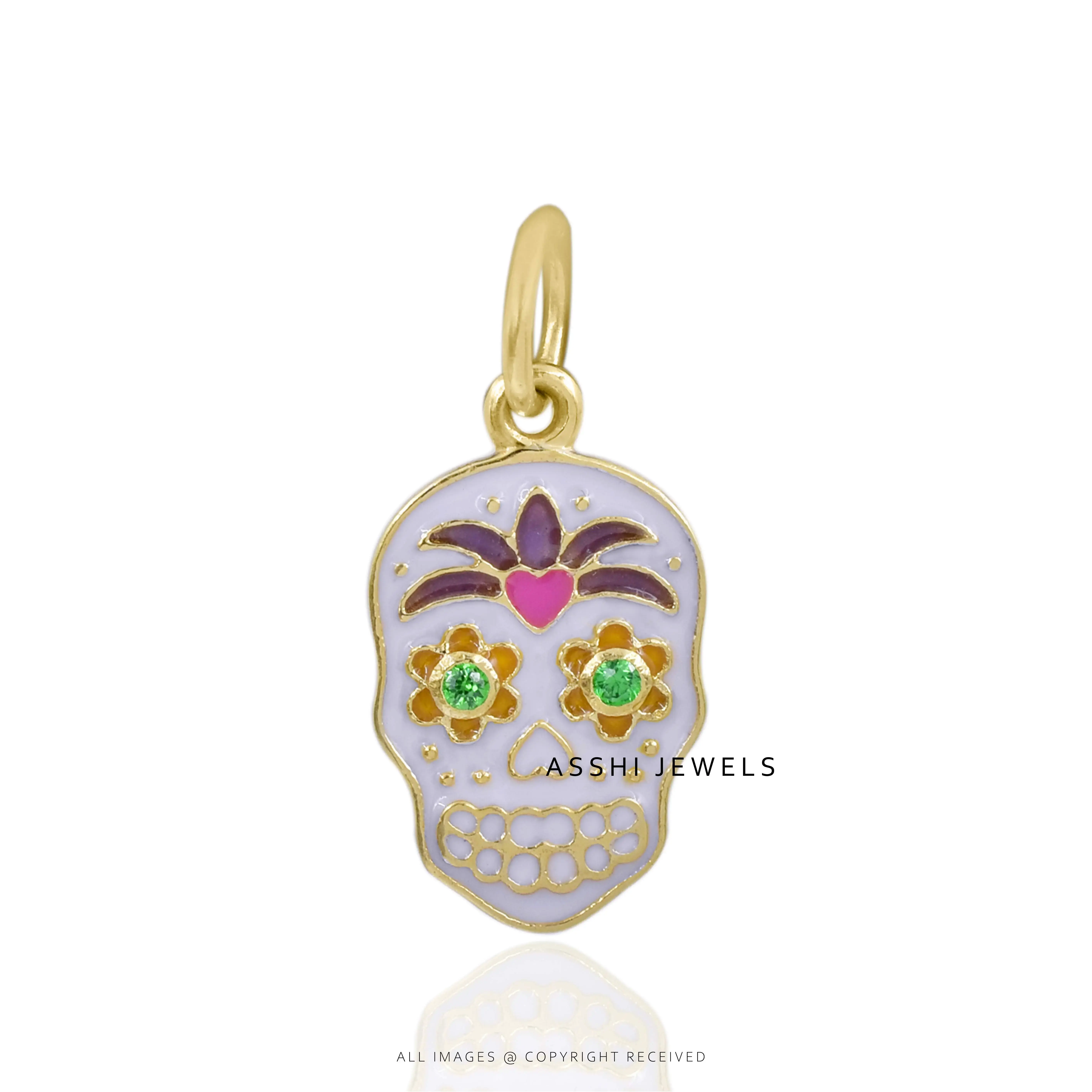Turn heads with this vibrant and edgy 14K yellow gold plated skull charm, featuring green cubic zirconia eyes and multi-colored enamel accents. This piece blends rebellious style with artistic flair, making it the perfect charm for those who love to stand out. The skull motif, a symbol of strength and individuality, is elevated with high-quality enamel detailing and a polished gold finish for a unique and luxurious touch.