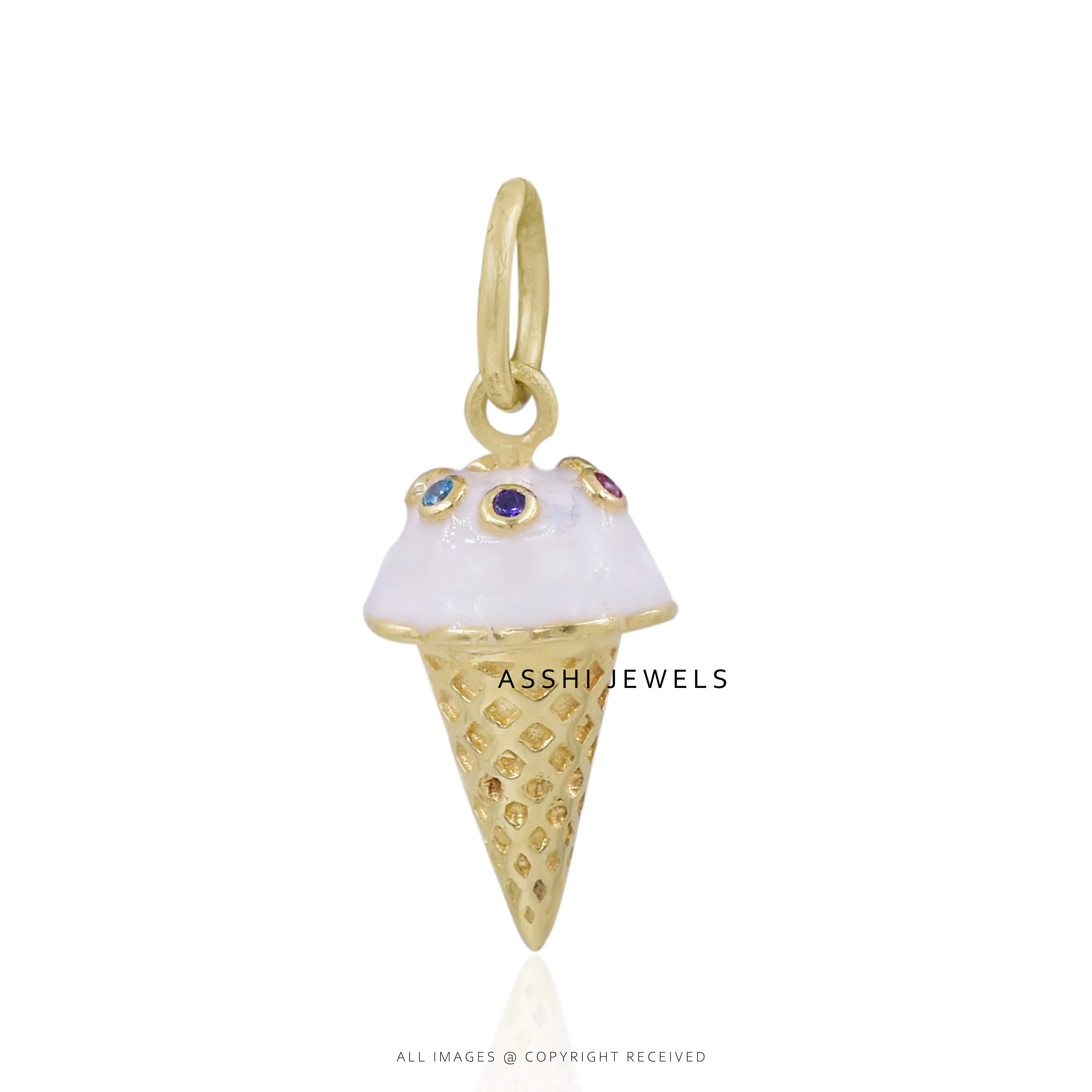Sweeten your style with this delightful 14K Yellow Gold Plated Ice Cream Cone Charm, bursting with playful color and sparkling detail. Featuring multi-colored cubic zirconia stones set in glossy enamel, this charm captures the joy of your favorite frozen treat with a touch of glamour.