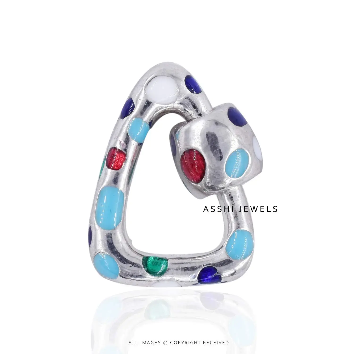 Bold, vibrant, and endlessly versatile — this 14K Yellow Gold Plated Multi Enamel Triangle Carabiner is a statement accessory made for creative styling. Featuring a sleek triangular shape and colorful enamel inlays, this carabiner adds a fun, modern twist to any chain, charm necklace, or bracelet.