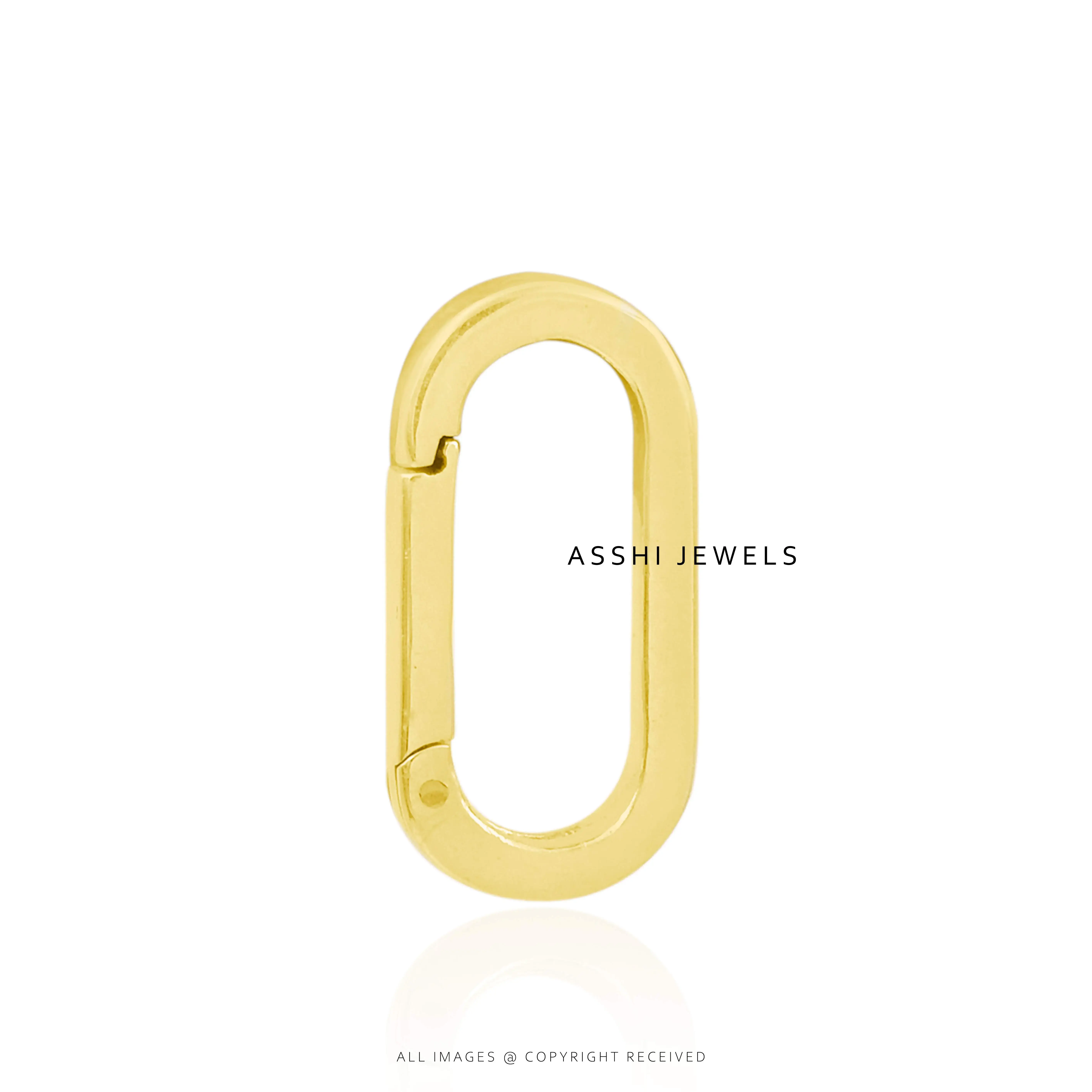 Enhance your jewelry collection with this sleek and versatile 14K Yellow Gold Plated Plain Oval Enhancer Lock. Designed with a simple yet elegant oval shape, this enhancer lock adds a polished finishing touch to your favorite chains, pendants, or charms.