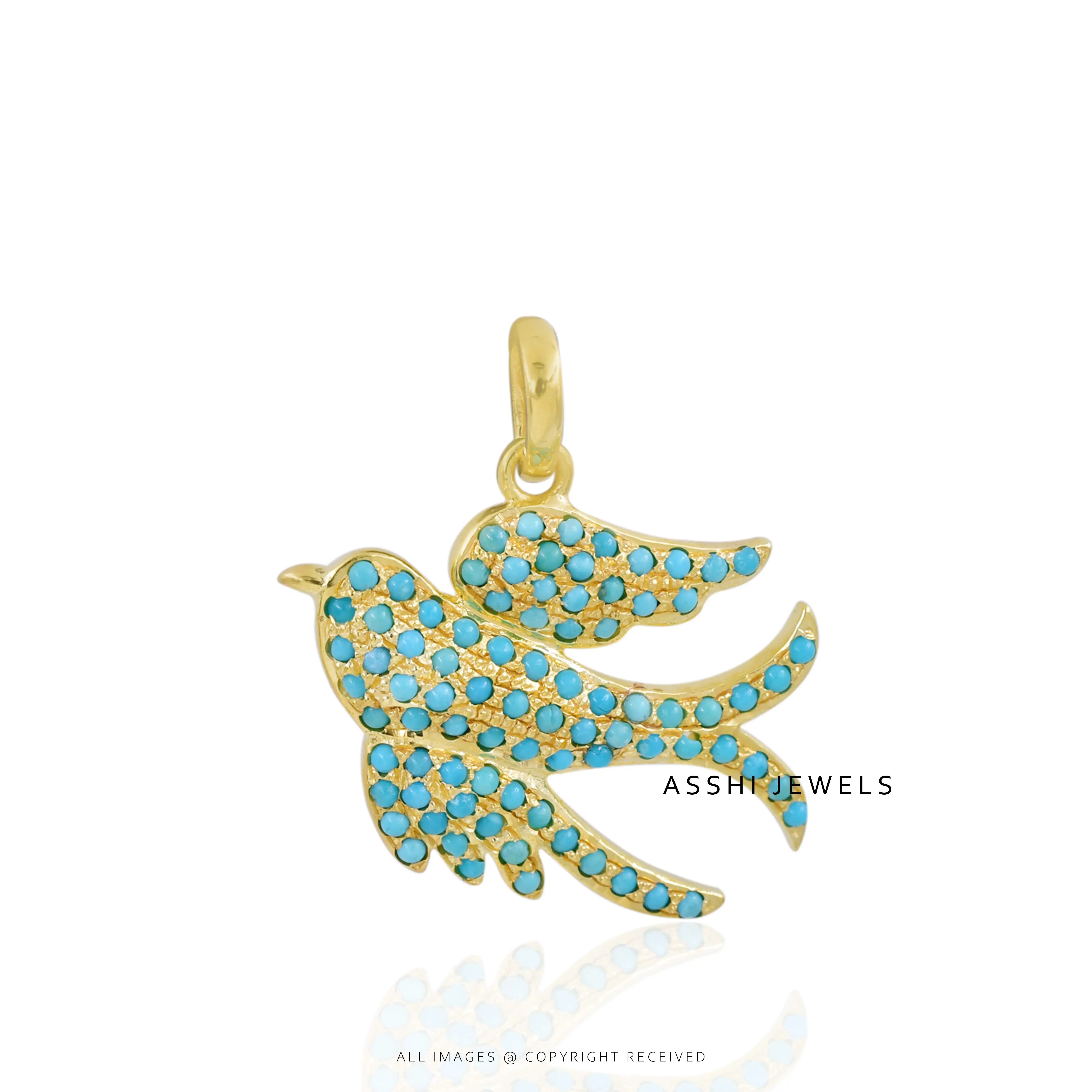 Celebrate freedom and beauty with this exquisite 14K yellow gold plated bird charm, featuring vibrant turquoise enamel detailing. This charming piece captures the delicate grace of a bird in flight, symbolizing hope, peace, and new beginnings. The warm gold plating combined with the bright turquoise color creates a stunning contrast, making it a standout addition to any jewelry collection.