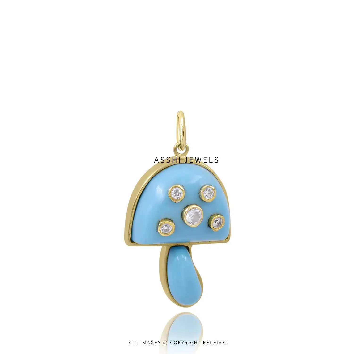 Add a vibrant touch of color and sparkling elegance to your jewelry collection with this Turquoise & White CZ Mushroom Pendant crafted in yellow gold-plated sterling silver. Expertly handmade from genuine 925 sterling silver, this eye-catching piece features smooth natural turquoise beautifully accented with dazzling white cubic zirconia stones. The striking contrast between the rich blue-green turquoise and shimmering CZ creates a captivating design that blends nature-inspired charm with modern sophistication.